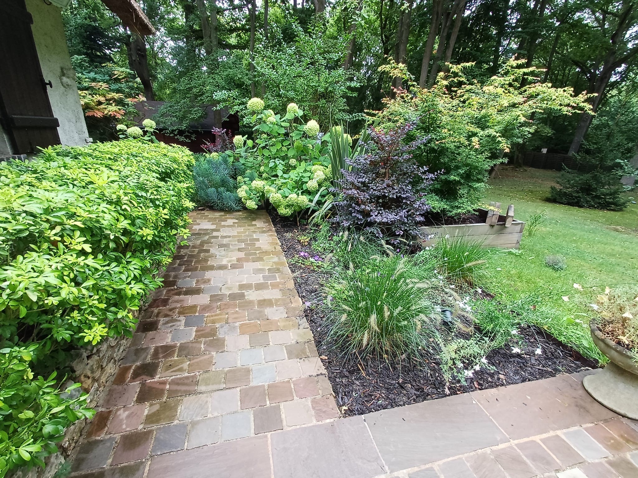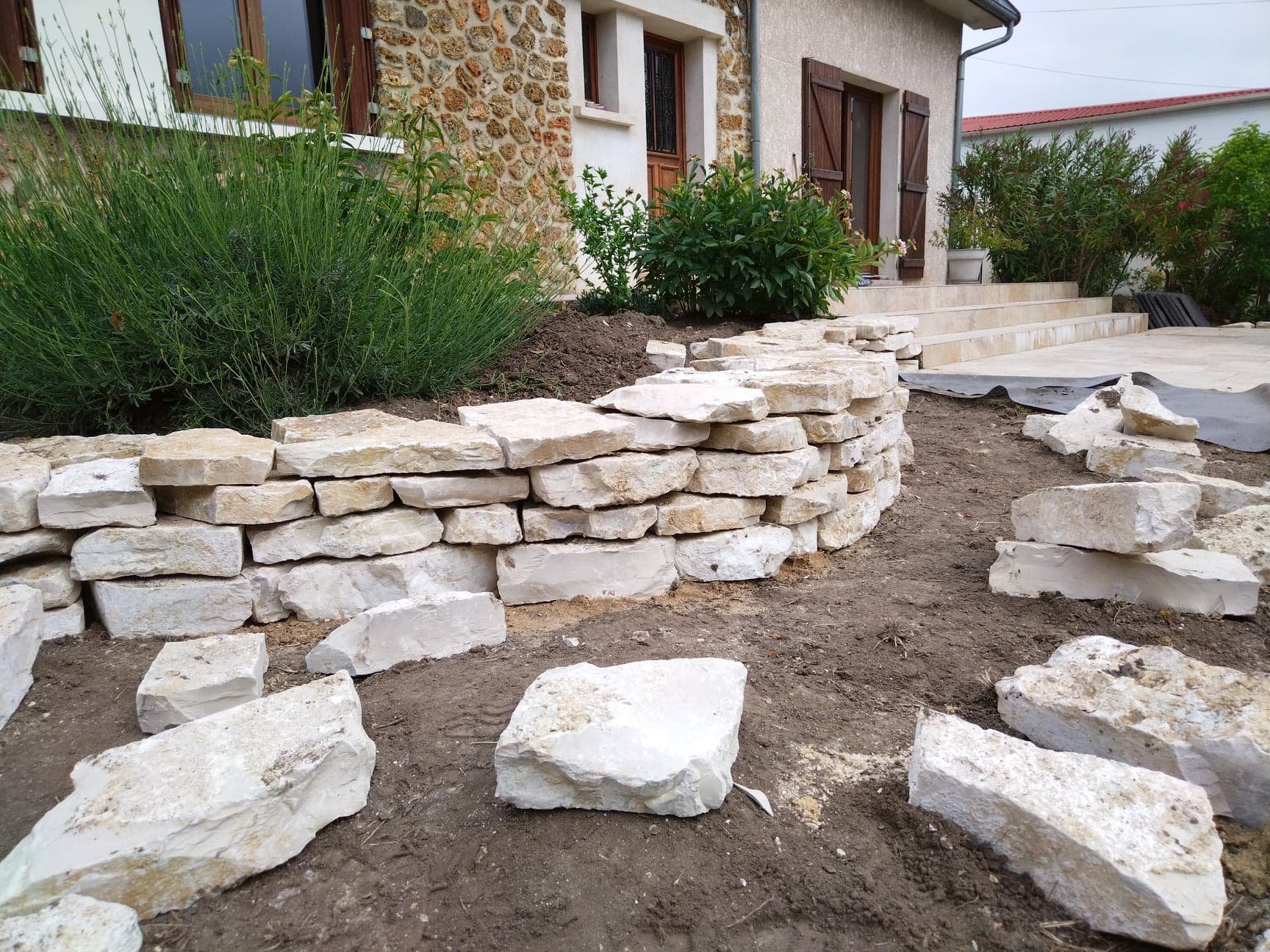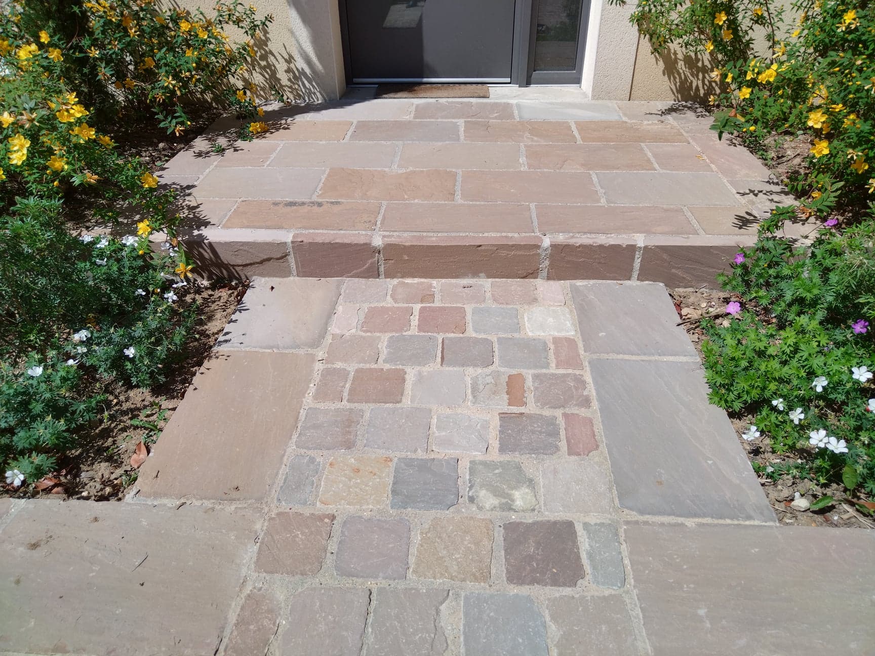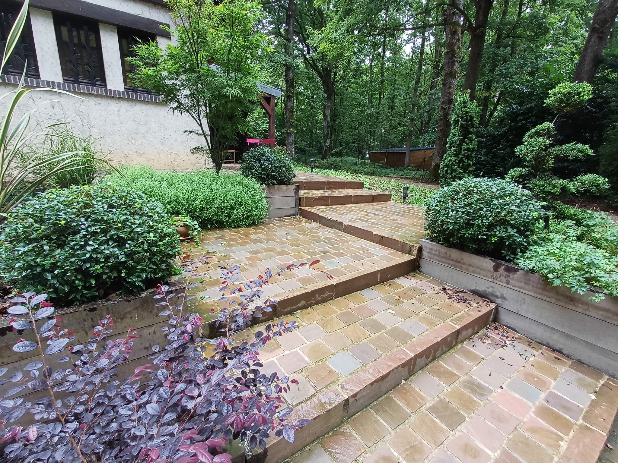 Terrasse (bois, pierre naturelle ou reconstituée), allée (pavés, dalles stabilisatrices ou pierre naturelle…), maçonnerie paysagère (muret de soutènement, escalier…), clôture.