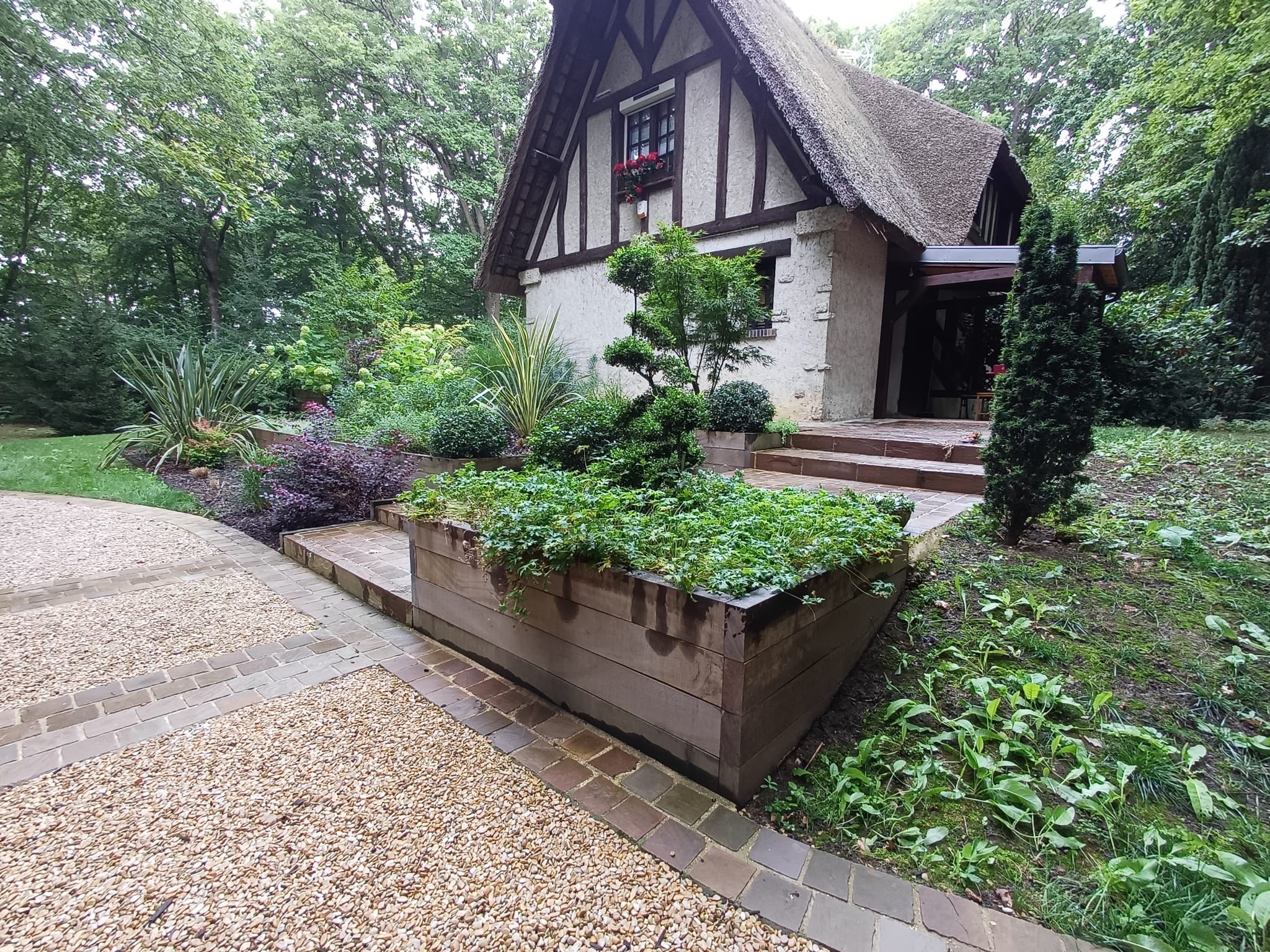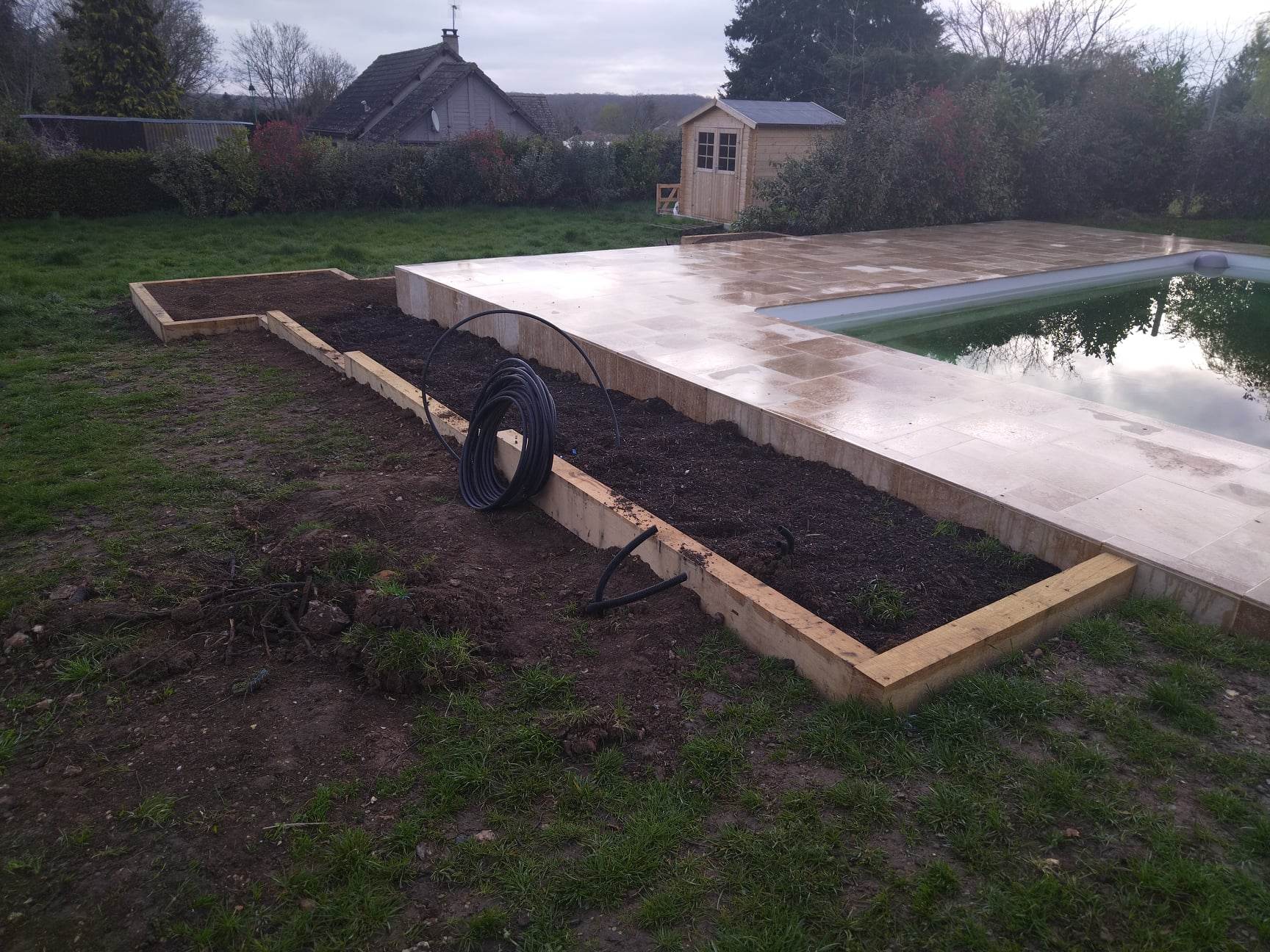 Plantation, gazon extérieur (naturel ou synthétique), installation de pergola ou boulodrome, éclairage extérieur.